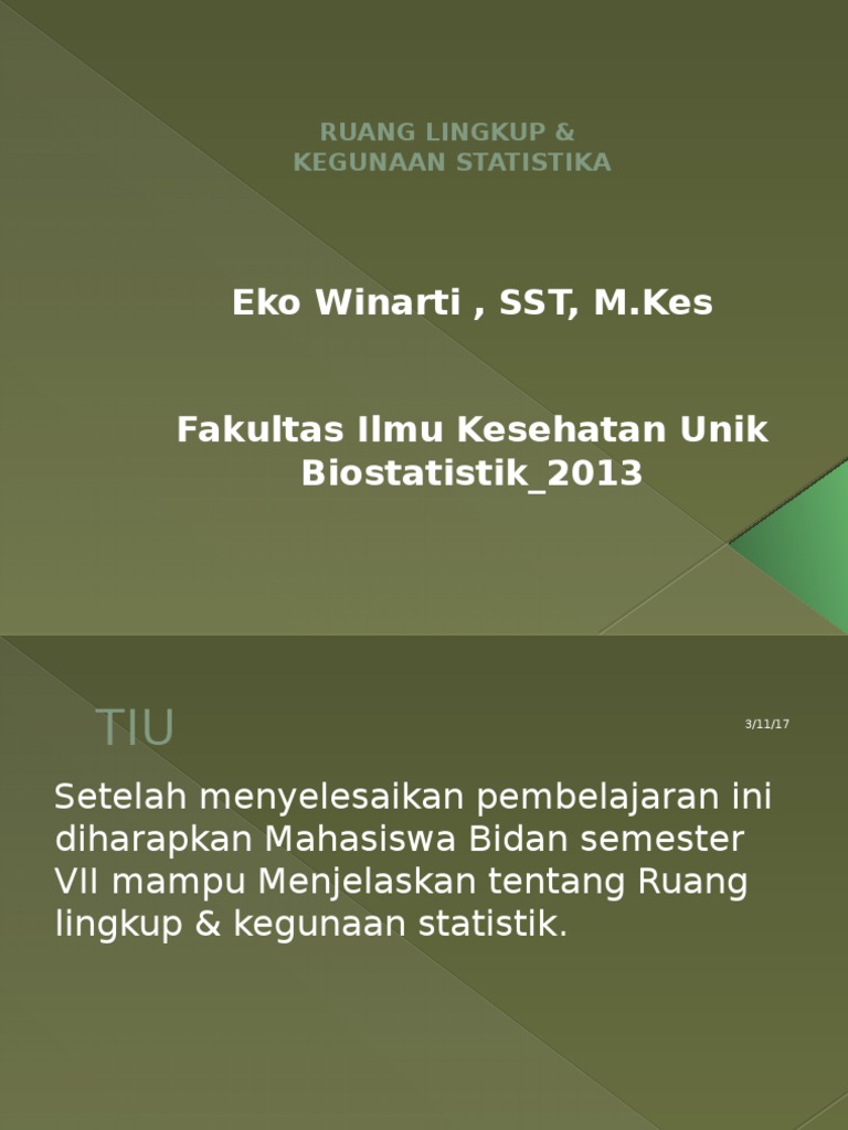 A.ruang lingkup statistik di fasyankes sebelum mengetahui ruang lingkup statistik di fasyankes kita harus mengetahui apa pengertian dari statistik terlebih dahulu, statistik adalah suatu ilmu yang. View statistika#2_ruang_lingkup.pptx from ece misc at university of notre dame. Statistika adalah cabang ilmu matematika terapan yang terdiri dari teori dan metoda mengenai bagaimana cara mengumpulkan, mengukur, mengklasifikasi, menghitung, menjelaskan, mensintesis, menganalisis, dan menafsirkan data yang diperoleh secara sistematis. Dengan demikian, dalam prakteknya kedua bagian statistik. Misalnya dalam bidang kesehatan :